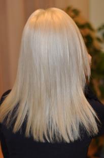 Plaukų šaknų dažymas "blond" spalva su pilku atspalviu ir lengvas plaukų galų tonavimas.